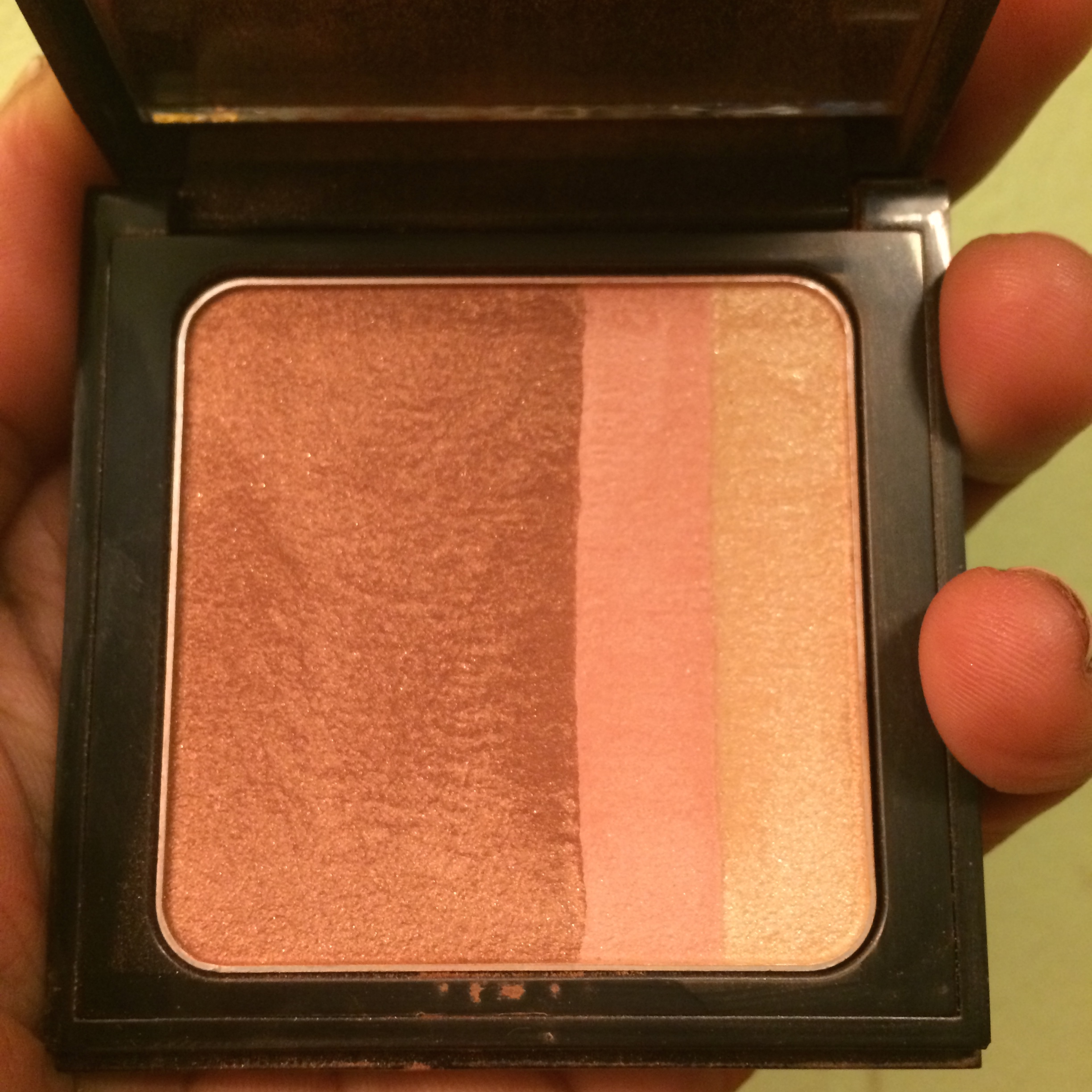 This blush is everything I want in a powder cheek product. It is a highlighter and blush all in one with a warm golden undertone. It gives a bronze glow to the cheek with a touch of pink and gold that will compliment any skin tone. It works perfectly on my complexion and I will definitely be wearing it after summer has ended. There is another shade in the collection which gives a pink flush to the skin. I would probably use that only on lighter skintones.